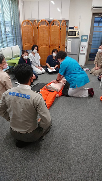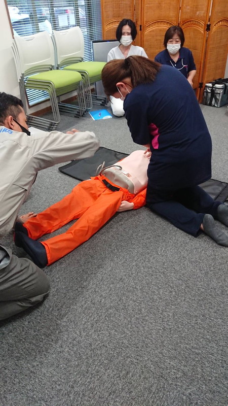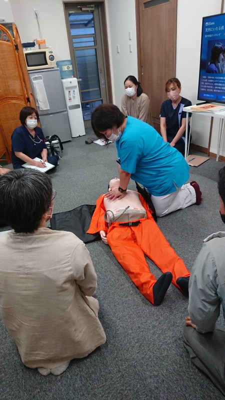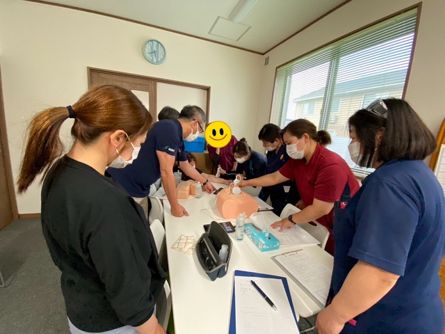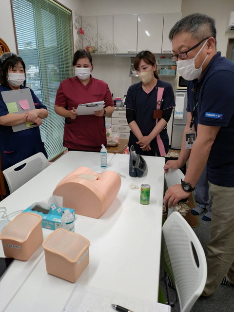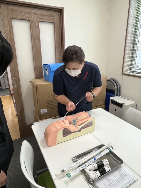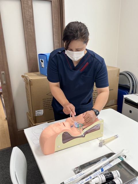 徳島県看護協会からモデル人形をお借りして、当社新人スタッフ(看護師・理学療法士など)の吸引の研修を実施しました。
